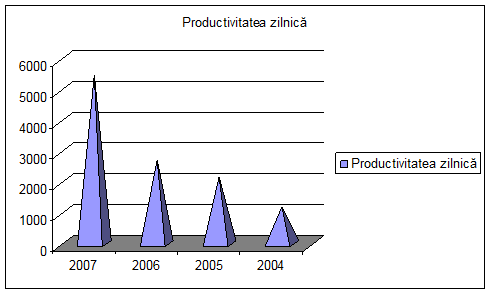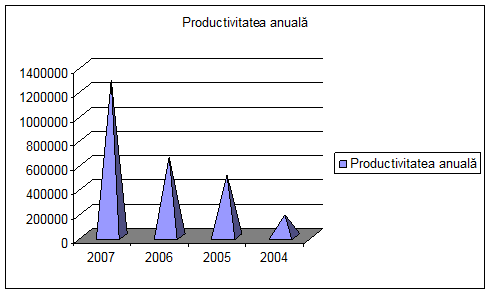 In ceea ce priveste indicii productivitatii muncii se constata ca acestia inregistreaza ramuri diferite de crestere de la un an la altul. Pe intreaga perioadaa analizata indicii productivitatii muncii au crescut, deci se poate spune ca in cadreul S.C Ara Promotion S.R.L a crescut eficenta cu care este realizata oferta de munca de la 180000 mii lei/persoana in 2004, la 1282395 mii lei/persoana in 2007, marindu-se de sapte ori mai mult in cei 4 ani de la infiintare.Se observa o sporire a productivitatii medii anuale cu +631635 mii lei/persoana, aceasta situatie s-a realizat pe seama sporirii productivitatii muncii zilnice, in conditiile reducerii numarului mediu de zile lucrate de un salariat. Din analiza productivitatii, se constata o crestere a nivelului acesteia in anul 2007, fata de anul 2006.Productivitatea medie zilnica, a crescut datorita maririi numarului de salariati si diminuarii de zile lucratoare ale anului 2007 fata de 2006.