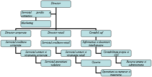 Organigrama a fost elaborata avandu-se in vedere obiectivele bancii privind orientarea spre client si structura activitatii pe trei domenii principale: