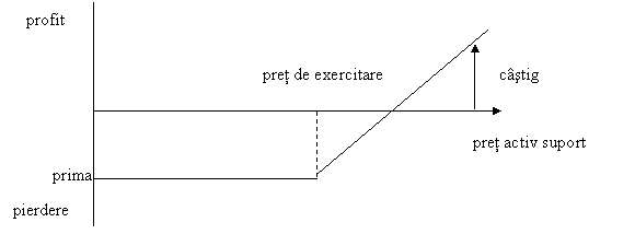 Operatorul achizitioneaza dreptul de a cumpara suportul la (pana la) scadenta la pretul de exercitiu (E), platind imediat prima (C). Se spera ca cursul suportului va atinge un nivel superior pretului de exercitiu majorat cu prima. Astfel, el va putea cumpara titlul la pretul E si il revinde imediat, realizand un profit. Daca previziunea se dovedeste a fi proasta, el sufera o pierdere maxima egala cu prima platita.