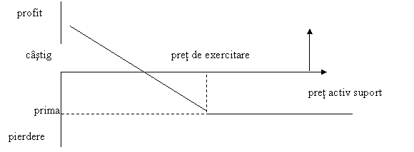 Operatorul achizitioneaza dreptul de a vinde suportul la (pana la) scadenta la pretul de exercitiu (E), platind imediat prima (P). Se spera ca cursul suportului va scadea. Optiunea ii limiteaza pierderea la marimea primei si ii ofera posibilitatea unui castig nelimitat in cazul scaderii cursului. Pentru cumparator, prima reprezinta un cost care se suporta indiferent daca contractul se exercita sau nu.