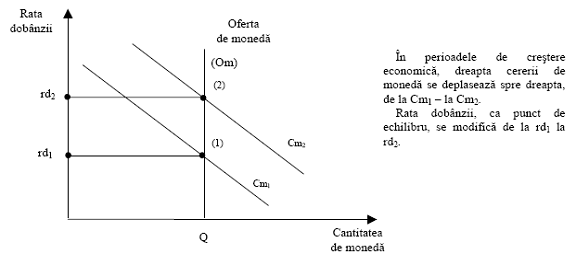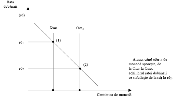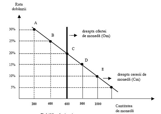 In continuare, diminuarea nivelului ratei dobanzii conduce la deplasarea cantitatii de moneda cerute spre cantitati tot mai mari, dupa cum indica punctele C, D, E, etc. Dreapta care uneste toate punctele A, B, C, D, E este denumita dreapta cererii de moneda (Cm). Daca in dimensionarea cantitatii de moneda din economie intervine banca de emisiune, care fixeaza un nivel constant al masei monetare (de exemplu cantitatea 600 u.m.) atunci dreapta care exprima oferta de moneda este linia verticala care porneste din acest punct. Echilibrul dintre cantitatea de moneda oferita si ceruta este dat de intersectia celor doua drepte, respectiv punctul C, in care: Cm = Om (cererea de moneda este egala cu oferta de moneda). Echilibrul se manifesta pentru un nivel al ratei dobanzii de 20%.