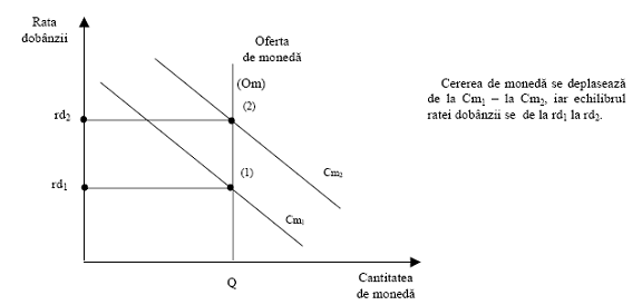 Scaderea ratei dobanzii de la 30% la 25% antreneaza, potrivit figurii, o majorare a cantitatii de moneda de la 200 u.m., la 400 u.m., respectiv deplasarea nivelului cererii din punctul A catre punctul B.