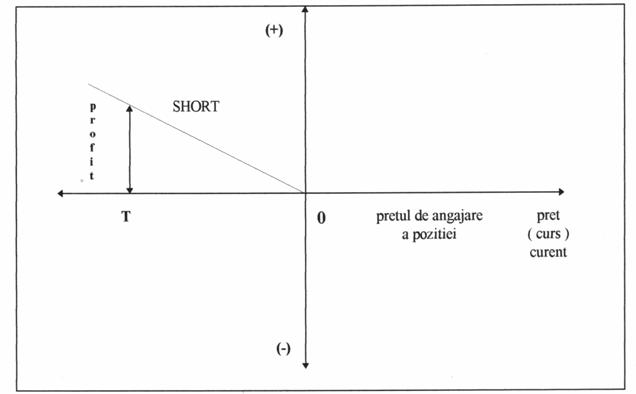 Graficul din figura reprezinta rezultatul unei pozitii short. Axa graficului indica: abscisa - evolutia cursului (pretului) curent al actiunii; ordonata - profitul/pierderea adusa de pozitia initiala; originea - pretul la care s-a angajat pozitia (a fost vanduta actiunea). Pozitia short este initiata in punctul O (pretul 100). Daca pretul curent scade (se deplaseaza spre stanga), va aduce detinatorului pozitiei un castig (in punctul T, pretul ajungand la 50, vanzatorul actiunii are un profit virtual de 50). Daca pretul creste, detinatorul pozitiei short pierde (la 120, pierde 20).