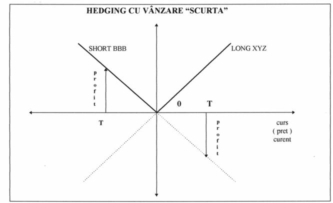 De exemplu, un investitor care detine un portofoliu de 1.000 actiuni XYZ face in momentul O o vanzare short pentru 1.000 actiuni XYZ la cursul de 36 $/actiune (MV = 36.000 $), anticipand o scadere a cursului. Ulterior (momentul T), estimarea se confirma, cursul ajungand la 30 $/actiune, adica o pierdere la portofoliu de 6.000 $ (1.000 x 36 -1.000 x 30). Cumparand la 30.000 $, este lichidata pozitia short si se obtine un castig de 6.000 $, care compenseaza valoarea portofoliului sau.