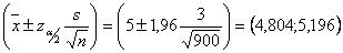 Exemplu: Sa se determine intervalul de incredere, garantat cu o probabilitate de 95% pentru media si nivelul total al unei caracteristici numerice X, daca esantionul selectat aleator repetat este de 36 de unitati (adica, 5% din colectivitatea generala), de medie 800 si abatere medie patratica 60.