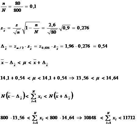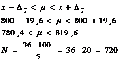 Exemplu: Sa se determine intervalul de incredere, garantat cu o probabilitate de 95% pentru media si nivelul total al unei caracteristici numerice X, daca esantionul selectat aleator repetat este de 36 de unitati (adica, 5% din colectivitatea generala), de medie 800 si abatere medie patratica 60.