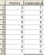 In continuare vom ilustra calculul corelatiei Pearson, o diagrama scatter si coeficientul de corelatie Spearman, folosind pentru aceasta datele din tabelul urmator, care reprezinta scoruri ale abilitatilor muzicale si matematice pentru 10 copii.