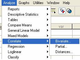 corelatiei Pearson se selecteaza "Analyze", "Correlate", "Bivariate"