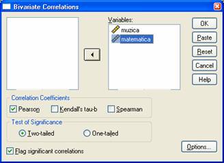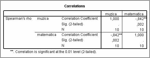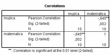 q Interpretarea psihologica va fi: "Exista o corelatie negativa semnificativa intre abilitatile muzicale si cele matematice, ceea ce semnifica faptul ca, cei cu un nivel ridicat al abilitatii muzicale au abilitati matematice scazute si viceversa".