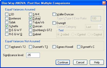 Rezultatele output-ului pot fi raportate astfel: O analiza de varianta unifactoriala pentru scoruri necorelate a demonstrat producerea unui efect general semnificativ pe tip de tratament medicamentos (F=13,94, p= 0,06). Prin Metoda Scheffe de analiza a intervalului s-a descoperit ca grupul hormonului 1 era diferit de grupul hormonului 2 (p= 0,07) si de grupul controlului placebo (p=0,24), dar nu s-au mai gasit alte diferente semnificative.