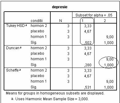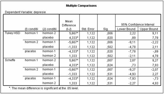 Daca se foloseste Testul Tukey al diferentei semnificative oneste (HSD), media de la grupul hormonului 1 este semnificativ diferita de media de la grupul hormonului 2 (semnificatia=0,06) si semnificatia de la media grupului Controlului placebo (semnificatia=0,020).