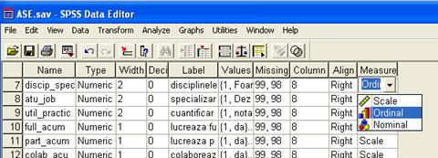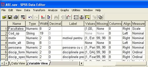 Prelucrarea datelor sub SPSS presupune familiarizarea cu doua ferestre de lucru: fereastra de definire si vizualizare a variabilelor -Variable View (figura 1) si fereastra de introducere si vizualizare a bazei de date - Data View ..