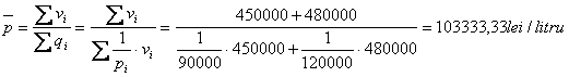 Exemplul : Un conducator auto cumpara ulei de motor, la pretul de 90.000 lei/litru, in valoare totala de 450.000 lei dintr-un magazin, iar din alt magazin, la pretul de 120.000 lei/litru, in aloare totala de 480.000 lei. Care a fost pretul mediu pe litru, pe care l-a platit?