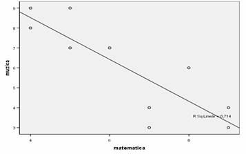 "Diagrama scatterplot a relatiei dintre abilitatile matematice si muzicale sugereaza o relatie liniara negativa intre cele doua variabile. Este posibila predictia cu acuratete a abilitatii muzicale a unei persoane cunoscand abilitatea sa matematica.