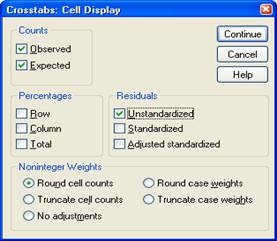 In sectiunea "Counts" se selecteaza "Expected". Se selecteaza "Unstandardized" in sectiunea "Residuals". Se selecteaze "Continue", apoi se apasa "OK in ecranul anterior care reapare. * Termenul "rezidual" se refera la diferente.