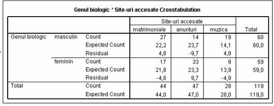 Tabel 1. Relatia dintre site-urile accesate si genul biologic.