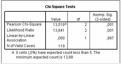 Valoarea chi-square este de 13,518, care, rotunjita la un numar cu doua zecimale, devine 13,52. Gradul sau de libertate este 2, iar probabilitatea two-tailed exacta este 0,001.