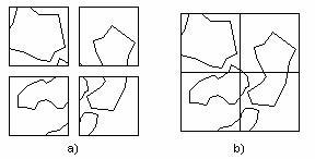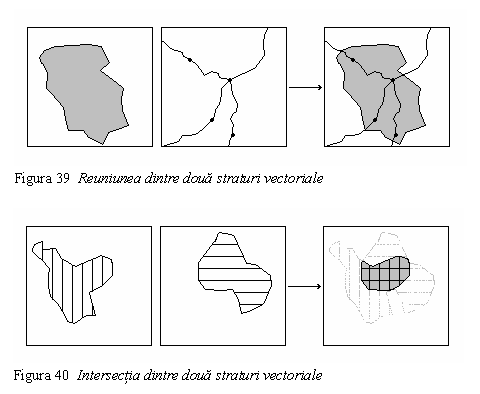 INTERSECT este operatia corespunzatoare operatorului logic AND. Cand doua straturi sunt supuse acestei operatii rezultatul, care este un coverage, va contine portiunea din primul strat care se va afla prin suprapunere si in cel de-al doilea strat. In plus se vor adauga si datele din al doilea strat. De subliniat ca datele trebuiesc sa fie de acelasi tip, adica ambele sa fie arc, ambele sa fie poligon sau straturile sa aiba primitive grafice comune etc. Intersectia dintre doua straturi care contin fiecare primitive grafice diferite este lipsita de obiect. De cele mai multe ori aceasta operatie se face pe straturi care contin doar poligoane (figura 40).