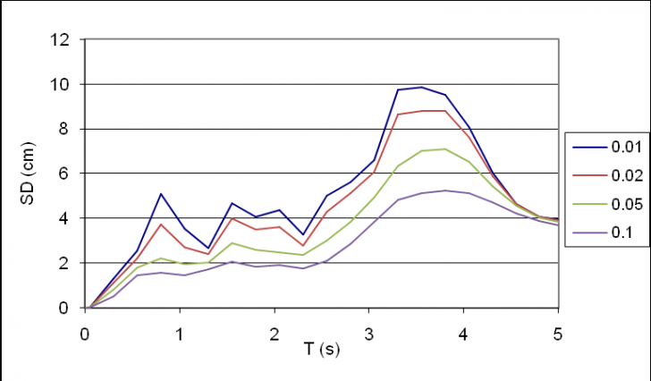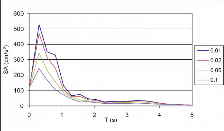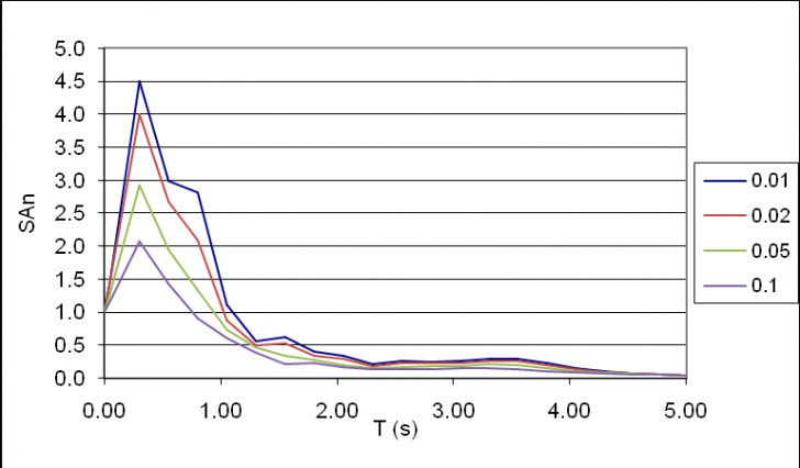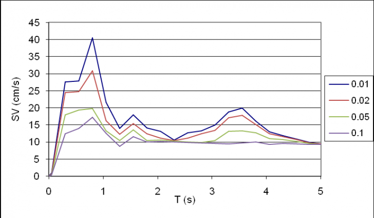 Spectrele seismice de raspuns (SA, San, SV, SD, PSV, PSA) pentru fractiuni din anortizarea critica avand valorile: 0.01, 0.02, 0.05, 0.01 si a variatie a perioadei proprii de vibratie de la 0 la 5 secunde cu pasul de perioada egal cu 0.25s ale miscarii seismice Northridge-01, 17.01.1994 statia NGA0976 componenta NORTHR/COM140 este prezentat in figura 4.