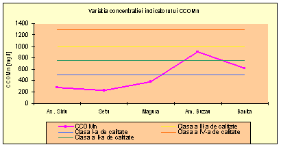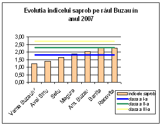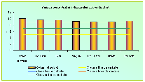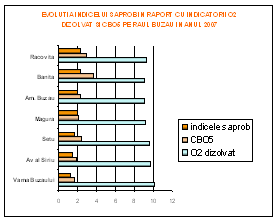 CBO5-ul creste invers proportional cu oxigenul dizolvat si direct proportional cu indicele saprob incepand din sectiunea Vama Buzaului si pana la Banita. Oxigenul dizolvat a inregistrat in aceasta sectiune o valoare mai mare decat in sectiunea Banita (vezi graficul).