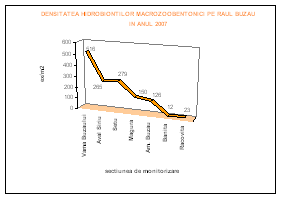 Pentru parametrul macrozoobentos au existat 3 campanii de prelevare, in lunile martie (21 taxoni/m2), mai (19 taxoni/m2) si septembrie (14 taxoni/m2). Biocenoza zoobentonica a prezentat o mare diversitate specifica: Baetis alpinus, Baetis rhodani, Baetis melanonix, Rhitrogena carpatoalpina, Rhitrogena gratianopolitana, Ecdyonurus torrentis (Ephemeroptera), Leuctra inermis, Isoperla obscura, Perla marginata, Protonemura nitida, Brachiptera risi (Plecoptera), Hydropsiche saxonica, Hydropsiche siltalai, Rhyacophila torrentium (Trichoptera), Hydraena gracilis (Coleoptera), Atherix ibis (Diptera). Aceasta diversitate specifica mare este demonstrata de valoarea medie crescuta a indicelui Simpson -0,9. Densitatea numerica a macronevertebratelor bioindicatoare a prezentat o valoare minima in septembrie (504 ex/m2) si una maxima in luna martie (803 ex/m2). In functie de acesti bioindicatori zoobentonici, indicele saprob mediu anual este 1,24, neexistand modifcari fata de anul 2006.