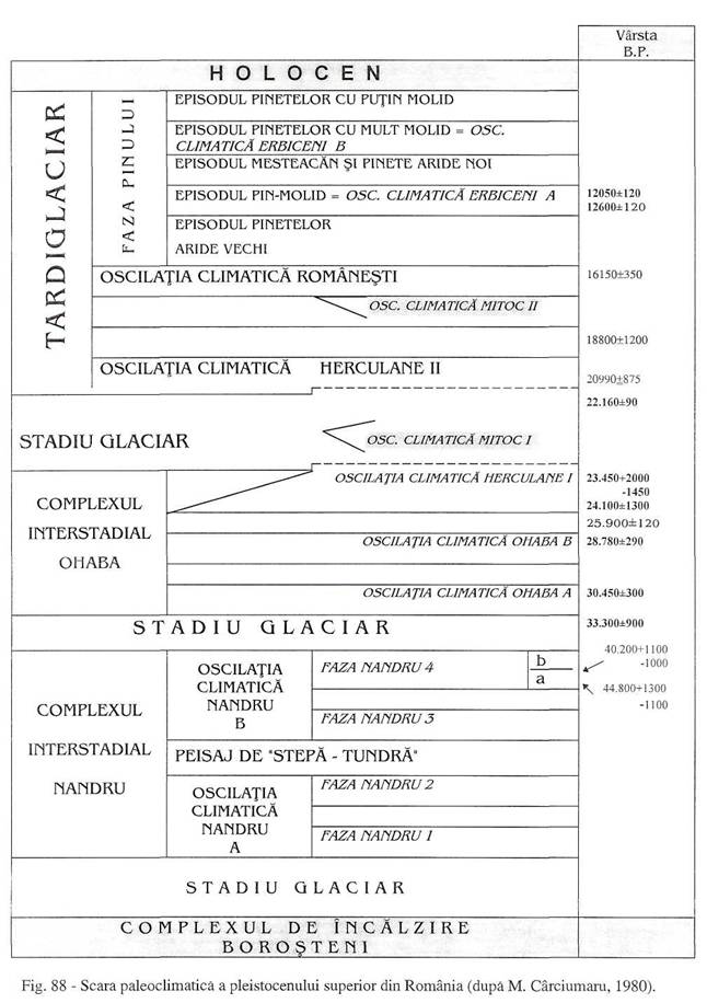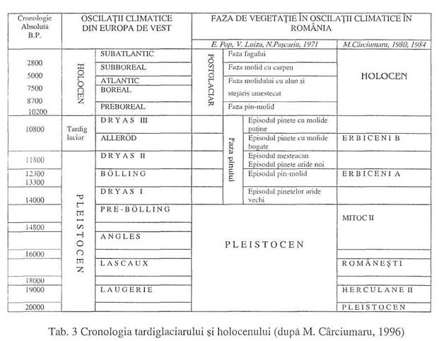 In acest sens, in Romania sfarsitul Pleistocenului s-a caracterizat prin alternarea unor oscilatii climatice, in sensul ca perioadele de ameliorare climatica au fost succedate de scurte etape de racire. Pentru ca oscilatiile climatice calde nu au mai atins amploarea celor anterioare (interstadiale), iar etapele reci nu au mai fost tot atat de riguroase ca stadiile glaciare, asistam in aceasta perioada la instalarea unor trasaturi distincte pentru sfarsitul pleistocenului care se deosebesc atat de perioadele anterioare, cat si de cele urmatoare. Pentru ca totusi in acest timp perioadele reci au fost suficient de ample, consideram ca tardiglaciarul trebuie alipit Pleistocenului. Mai mult, ritmul in care s-au succedat pe teritoriul Romaniei, precum si faptul ca amploarea lor s-a apropiat mai mult de cele corespondente oscilatiilor Allerod si Bolling din Europa de nord, optam ca si o serie de oscilatii climatice petrecute anterior acestora - Herculane II, Romanesti, Mitoc II, trebuie alipite Tardiglaciarului (tab.3). In consecinta, Tardiglaciarul pe teritoriul tarii noastre ar cuprinde o perioada de timp mai mare decat cea care ii este atribuita in vestul Europei, incluzand si oscilatiile climatice Herculane II, Romanesti si Mitoc II carora le corespund in Europa apuseana interstadiul Laugerie-Lascaux si oscilatia climatica Angles (sau Pre-Bolling).