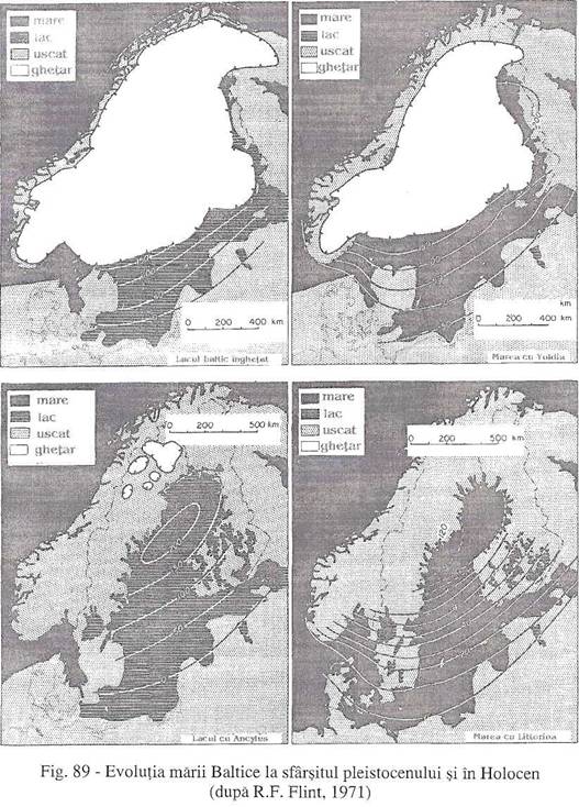 Intre 11.000 si 4.000 B.P. in bazinul marii Baltice s-au succedat o serie de lacuri si mari de extensiune variabila (tab. 4, fig. 89). Incepand cu 9.000 B.P. campia maritima a Flandrei a fost submersa, de la 7.500 B.P. era in jurul Pasului Calais si a nordului Tarilor de Jos, iar spre 3.500 B.P. ajungea in Anglia.