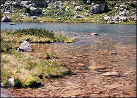 Lacul Pietrele - 1990 m; 0,9 m; 0,48 ha - in caldarea Pietrele si Lacurile Pietricelele cu cele 17 laculete din caldarea Pietricelele apartin bazinului vaii Pietrele.