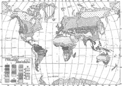 I. Zona calda (1 - climatul intertropical permanent umed; 2 - climatul intertropical musonic; 3 - climatul intertropical alternativ; 4 climatul tropical arid; 4 - climatul tropical semiarid; 6 - climatul subtropical arid; 7 - climatul subtropical semiarid; 8 - climatul subtropical cu veri uscate sau mediteranean; 9 - climatul subtropical umed; 10- climatul muntilor inalti din zona calda); Zonele temperate (11 - climatul temperat oceanic; 12 - climatul temperat de tranzitie; 13 - climatul temperat continental; 14 - climatul temperat musonic; 15 - climatul temperat semiarid; 16 - climatul temperat arid; 17 - climatul muntilor inalti din zonele temperate); I Zonele reci (18 - climatul subpolar oceanic; 19 - climatul subpolar continental; 20 - climatul polar; 21 - climatul polar excesiv) (dupa S. Ciulache)