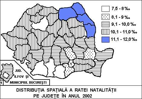 Explicati rolul factorilor implicati in evolutia ratei fertilitatii populatiei din Romania si in distributia spatiala a ratei natalitatii. Cititi si interpretati harta ratei natalitatii de mai jos, avand in vedere valorile cele mai scazute si cele mai ridicate ale acesteia.