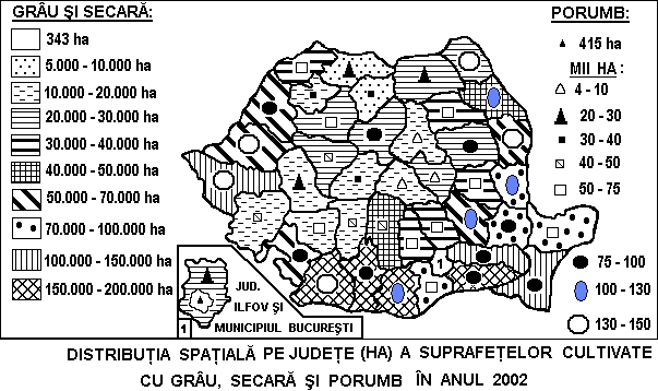 Analizati harta culturilor cerealiere. Explicati distributia spatiala a culturilor de grau, secara si porumb pe judete.