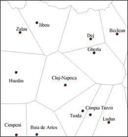 Fig. 24. Determinarea zonei de influenta a orasului Cluj-Napoca prin metoda poligoanelor lui Thiessen. Sursa: autorul