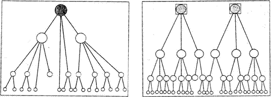 Fig. 30. Stanga: sisteme de asezari monocentrice echilibrate. Dreapta: sisteme de asezari bicentrice. Sursa: I. Ianos, J.B. Humeau (2000)