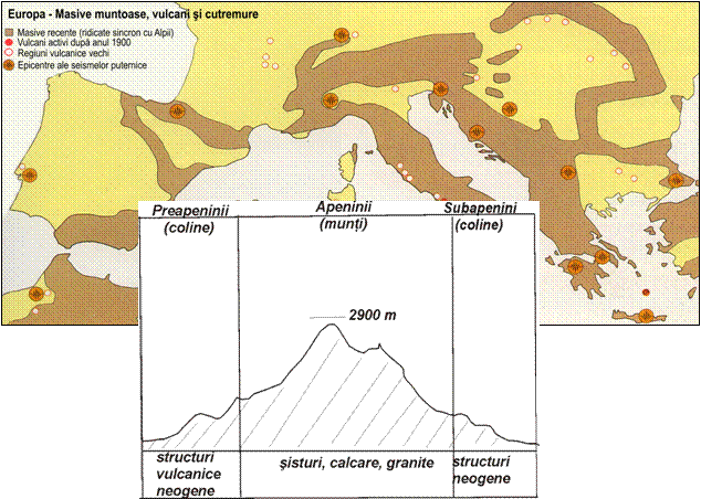 Altitudinile maxime depasesc 2.900 m (vf. Gran Sasso d'Italia sau Mailo (2.795 m) in culmile Abruzzi si scad catre nord (M-tii Cimone, 2.165 m) si sud (Pollino, 2.267 m). Apeninii s-au ridicat cu ocazia cutarilor alpine, dar cuprind in matricea alpina si structuri mai vechi, hercinice. Sun aspect geomorfologic se impart in trei subunitati: Apeninii de Nord, Centrali si Sudici.