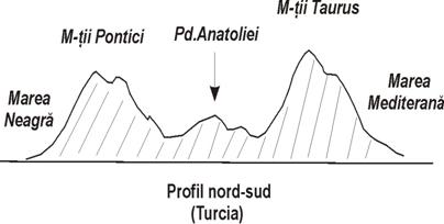 Podisul Anatoliei. Relieful Podisului Anatoliei este reprezentat prin platouri situate la altitudini care variaza intre 1.000-1.500 m, o parte din ele conservand suprafete de eroziune dezvoltate pe o structura granitica si cristalina. Aparitia in partea central-estica (in estul depresiunii Licaonia) a unor depozite vulcanice neozoice, (Erciyes-3.916 m), demonstreaza existenta unor miscari postmiocene insotite de flexuri in lungul carora au aparut masele de lava, baza viitorului relief.