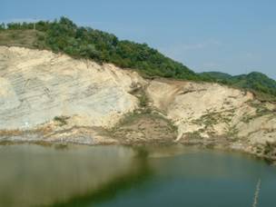 ) Ocnele Mari: sectiune geologica a prabusirii si lacul rezultat in urma prabusirii (august 2003