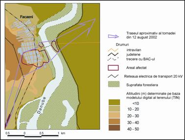 In seara zilei de 12 august 2002, in jurul orelor 19,30-19,45, partile de sud si sud-est ale localitatii Facaeni (Fig. 6 si 7) au fost confruntate cu intensificari extrem de puternice ale vantului, fara precipitatii, care au afectat grav peste 30 de locuinte, au avariat peste 400 de gospodarii (din care 14 locuinte distruse din temeli si 20 cu structura de rezistenta distrusa) si au cauzat moartea a 2 persoane. Fenomenul de la Facaeni face parte dintr-un sir de evenimente care s-au desfasurat in seara zilei de 12.08.2002 pe un areal extins (Fig. 8) din apropierea orasul Fetesti (Ialomita) pana in localitatea Ghindaresti (Constanta).