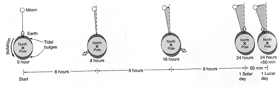 Din punctul nostru de vedere, de pe pamant, mareele par sa faca apa sa inunde tarmul si apoi sa se retraga. De fapt, rotatia Pamantului este responsabila pentru faptul ca intram si iesim din flux. Cheia intelegerii dezvoltata in modelul simplificat prezentat mai sus este ca Pamantul se roteste in interiorul si in afara acestor cocoase de apa, care se afla in pozitii fixe fata de luna si fata de soare. Cu alte cuvinte, Pamantul se roteste constant in interiorul unui fluid al oceanului, ale carui valuri imense sunt produse de luna si de soare.