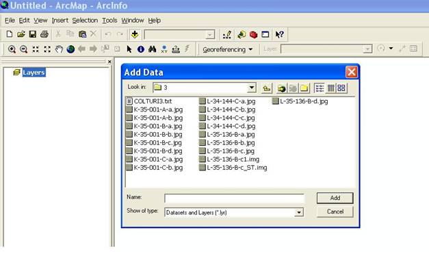 B. Trapezul se aduce in ArcMap cu butonul Add Data din bara de meniu, din directorul in care avem trapezele pe care dorim sa le georeferentiem, facem click pe trapezul care vrem sa-l aducem si apoi Add.