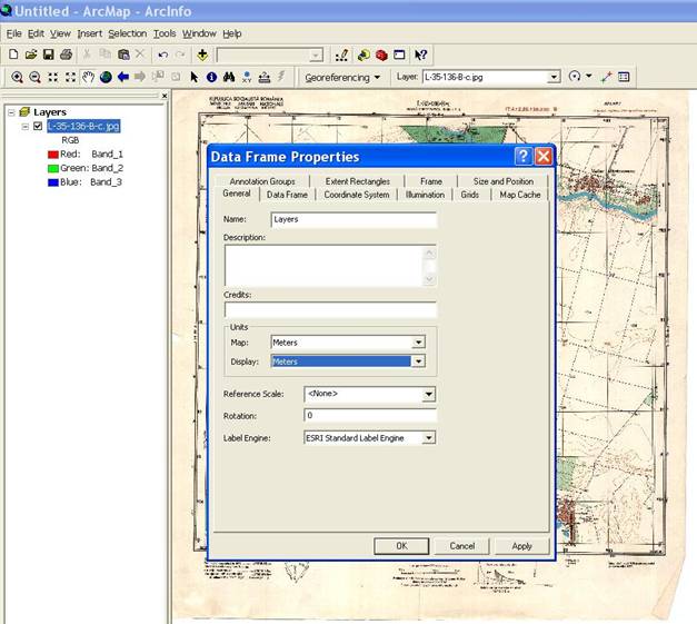 C. Verificam daca ne apare in bara de meniu Georeferencing, daca nu ne apare mergem in Tools/Customize/Toolbars si bifam casuta cu Georeferencing, apoi tragem bara de Georeferencing in bara de meniu. Acum mergem in View din bara de meniu, pe Data Frame Properties/General la Units la Map si punem din lista derulanta Meters si mergem si la Display si punem din lista derulanta tot Meters, facem click cu mousul pe Apply si OK . Pentru control vizualizam coltul din dreapta jos al ferestrei ArcMap de pe display unde trebuie sa apara langa coordonatele X si Y scris Meters in loc de Unknown.