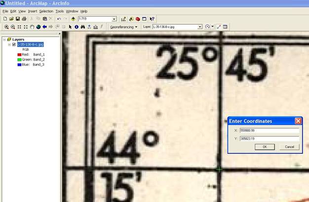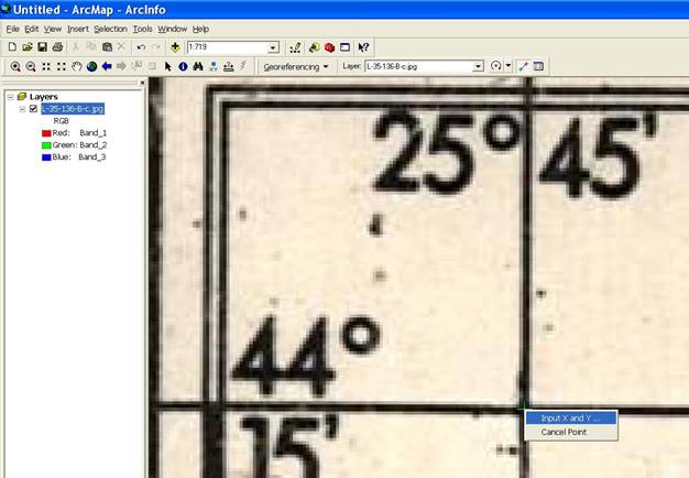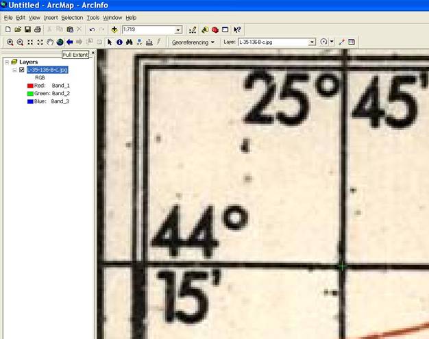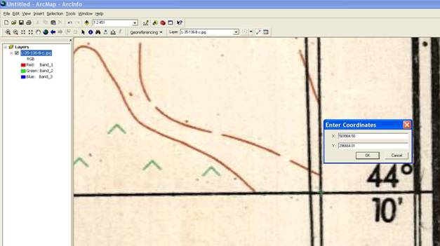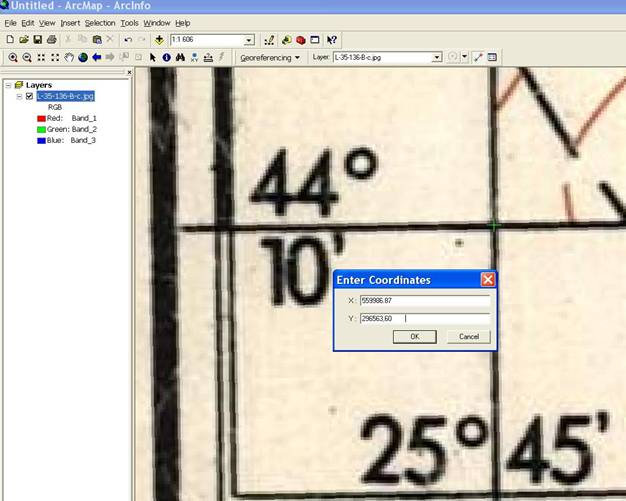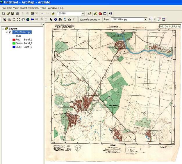 D. Acum mergem in bara de Georeferencing si cu butonul Add Control Points mergem pe punctul 1 al coltului trapezului de georeferentiat, dup ace in prealabil am facut cu butonul + din bara de meniu un zoom convenabil