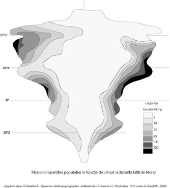 Trei tipuri de constrangeri climatice se impun: termice, pluviometrice si higrotermice. Astfel frigul, ariditatea si caldura umeda sunt vectorii prin care climatul limiteaza distributia populatie Originara din zona tropicala, specia umana prefera temperaturile cuprinse intre 10-30sC, putandu-se adapta sezonier si la temperaturi care depasesc aceste limite (fig).