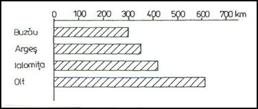 Diagrama in benzi se intrebuinteaza pentru reprezentarea grafica a lungimii unor fluvii, rauri, sosele, cai ferate etc. De exemplu, putem reprezenta printr-o diagrama in benzi, lungimea unor rauri din Romania, cum ar fi: Arges - 350 km, Buzau - 302 km, Ialomita - 417 km si Olt - 615 km. Pe axa orizontala OX, consideram ca la fiecare centimetru corespund 100 km, benzile astfel realizate, asezandu-se pe axa verticala OY (fig. 17).