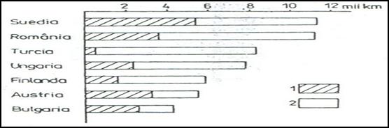 Fig. 18. Diagrama structurala in benzi. (Structura cailor ferate in 7 state europene in anul 2000; 1- cale ferata electrificata; 2 - cale ferata neelectrificata)
