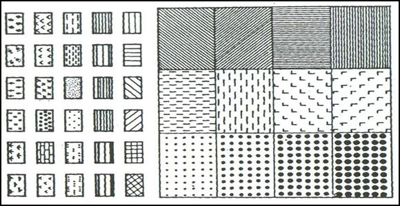 Pentru a putea fi reprezentate, aceste dimensiuni se reduc, stabilind de pilda ca la 1 cm de pe hartie sa corespunda 1,5 km de pe teren si se obtin urmatoarele valori pentru laturile patratelor: l1 = 21,6 mm, l2 = 19,06 mm si l1 = 10,73 mm (fig. 21). Patratele pot fi dispuse in diferite moduri si se coloreaza sau se hasureaza. Este necesar sa existe o legenda in care sa se explice semnificatia culorilor sau hasurilor folosite.