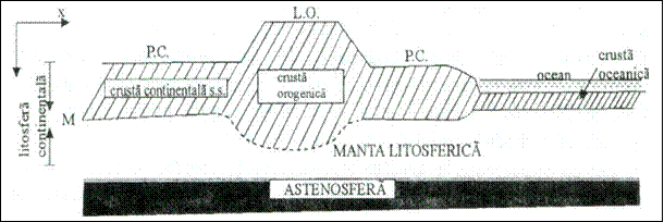 P.C. platforma continentala; L. O. - lant orogenic;M - discontinuitatea Moho.