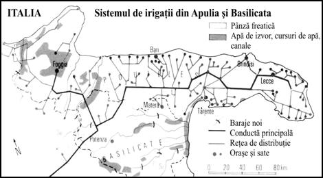 Italia de Sud (Mezzogiorno). Cu o importanta pondere a activitatilor agricole, cu rolul si hinterlnadul cuprinzator al orasului Napoli si noile zone industriale formate. Italia de Sud accede treptat la competitivitatea impusa de celelalte regiuni. Apa este o problema vitala a sudului. De aceea in 1906 a inceput construirea unui apeduct terminat in 1915. In 1950 au fost concepute noi proiecte. Astfel ca regiunea Tarente a devenit una fertila, productiva unde se cultiva legume, pomi fructiferi facand din Apulia un important exportator de produse agricole.