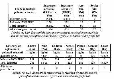 Din punct de vedere al evacuarilor de substante poluante in resursele de apa de suprafata, in tabelul 3.10 se prezinta cantitatile monitorizate de substante organice (exprimate ca CCO Cr si CBO5) si de nutrienti (azot total si fosfor total) la nivelul anului 2007 pe categorii de surse de poluare. De asemenea, in tabelul 3.11 se prezinta aceeasi situatie, avand in vedere cantitatile de metale evacuate si monitorizate.