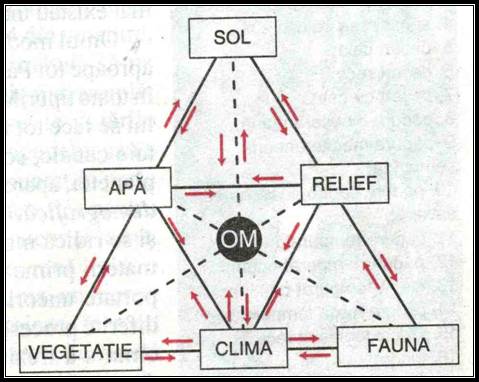 Fig.1 Interactiuni intre elementele mediului natural si om (dupa Gr. Posea, Iuliana Armas)