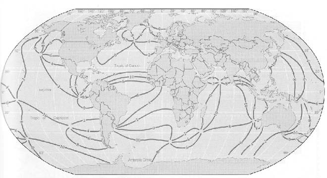 In oceanul deschis crestele si bazele valului se rotesc in jurul unui punct aproape de centrul fiecarei celule. Acest punct este numit punct amphidromic si aici nu exista o inaltime a mareei. Radial din acest punct pornesc linii ce unesc puncte de-a lungul carora fluxul se va produce simultan. Figura 1-14 arata aceste linii, etichetate sa indice timpul fluxului in ore dupa ce luna depaseste meridianul Greenwich. Timpul prezentat in figura 1-14 indica ca rotatia valului se face invers fata de acele de ceas in emisfera nordica si in sensul acelor de ceas in emisfera sudica. Valul realizeaza o rotatie completa in timpul unei perioade de flux si reflux. Marimea acestor celule este limitatata de faptul ca mareea trebuie sa faca o roatie completa in timpul unei peroioade de flux si reflux (aproximativ 12 ore lunare).